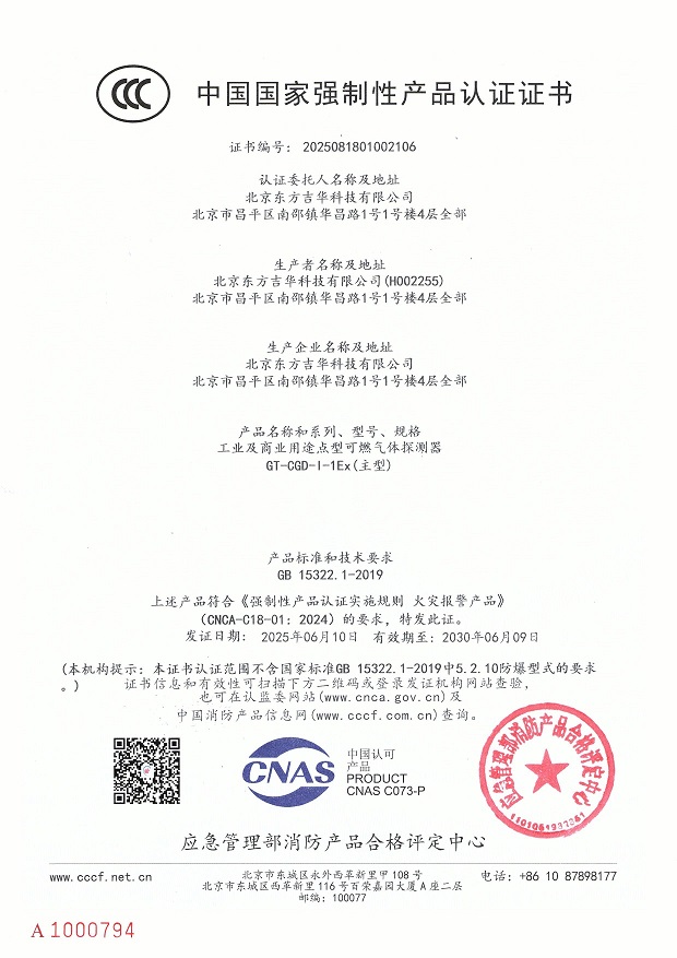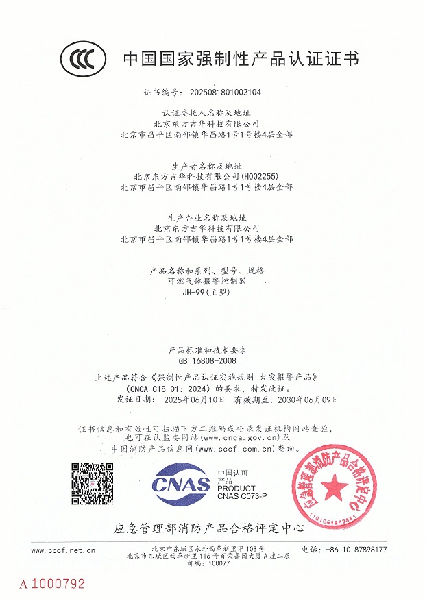 捷报传佳音,奋楫再扬帆!我们荣幸宣布:北京东方吉华科技有限公司核心产品可燃气体探测器及报警控制器,经应急管理部消防产品合格评定中心