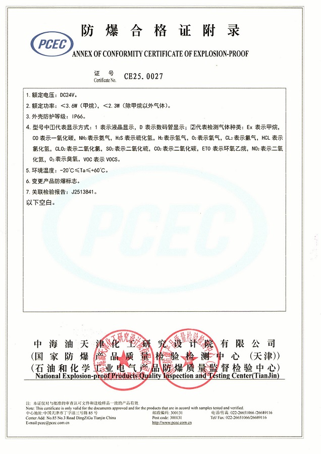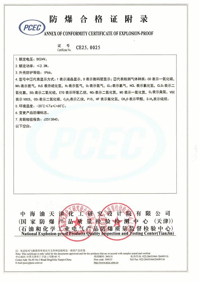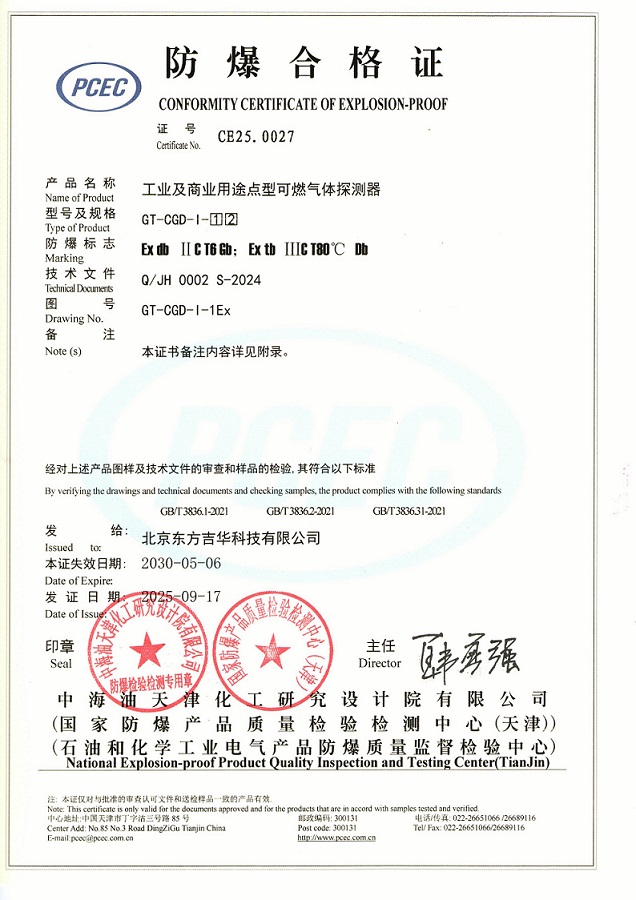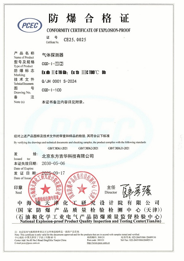 北京东方吉华科有限公司生产的气体探测器已取得Ex db II C T6 Gb和Ex tb IIIC T180℃ Db双防爆的防爆标志。