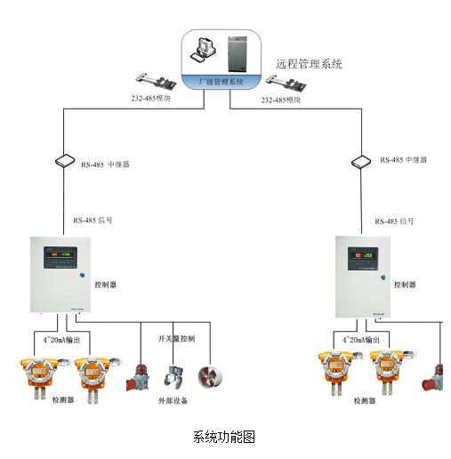 现场检测控制系统由气体检测报警器,气体报警控制器,声光报警、排风、联动装置等现场设备共同组成。上级监控系统根据现场条件可选择不同的系统组网方式构建,实现数据传输、远程控制等功能。其中,气体报警控制器作为初级的气体报警控制设备连接气体检测报警器,并控制现场声光报警器、风机等外部设备,实现现场报警、控制功能;同时通过上位机通讯的方式将检测信息传输给工控机(或系统设备),利用系统软件来实现数据显示、分析、控制等功能,构成完整的气体检测报警系统。